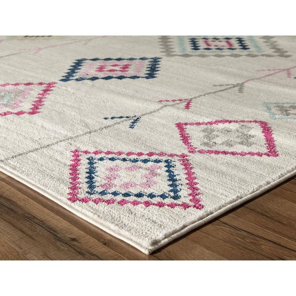 Rows of colorful, geometric shapes make their way down the Rumi area rug. Placed on a neutral-toned backdrop, the Moroccan-style motif is a true charmer. Power loomed and constructed from soft touch polypropylene, the Rumi boasts an almost half-inch pile that is ultra soft and super shiny. From your bedroom to your dining room, this home accessory can work in just about any room.