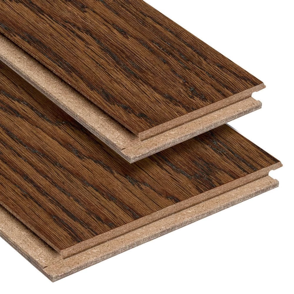 Hand-Scraped Distressed Montecito Oak Click-Lock Engineered Hardwood Flooring creates a warm, welcoming ambience in any residential interior. Featuring rich, natural woodgrains in beautifully random patterns and a hand-scraped finish for a rustic touch, these boards are certain to add space-defining allure to your home. The substantial planks are 3/8 in. thick and have the versatility to be installed on any level of the house using glue or simply floating over a subfloor. Protection from everyday wear comes courtesy of a seven-layer aluminum oxide finish for utmost resilience to your family’s foot traffic, allowing the floors to retain maximum luster. This product has earned GREENGUARD Indoor Air Quality Certification and has been tested for more than 10,000 volatile organic compounds, including formaldehyde, to meet these standards.