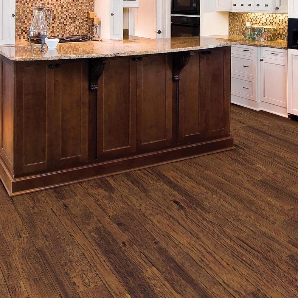 - Prefinished montecito oak, medium color, hand scraped distressed finish